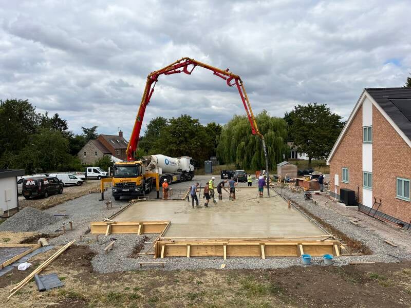 Wednesday 16th July was a big day for us - after a lot of hard work and six truck loads of eco-cement (more on that below) we are now officially "out of the ground". The day started well, no rain forecast and the temperature was ideal - around 18C at 8am. The pump lorry arrived on time and was in position to pump the cement across our foundation footprint BUT where were the trucks which were promised to arrive from 8:45?!