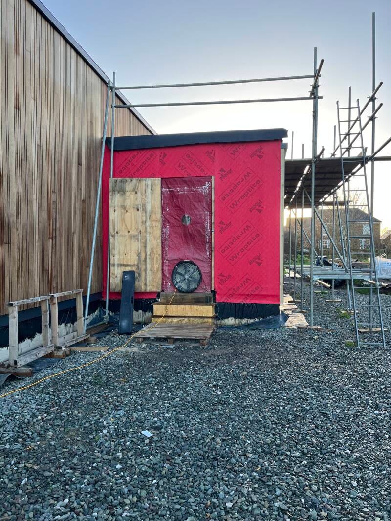 19 Dec - Day 105 Air tightness test - a creditable score of 1.2 cubic meters per hour per square meter at 50 Pascals. (Compared to a maximum permitted building regs value of 8.0)